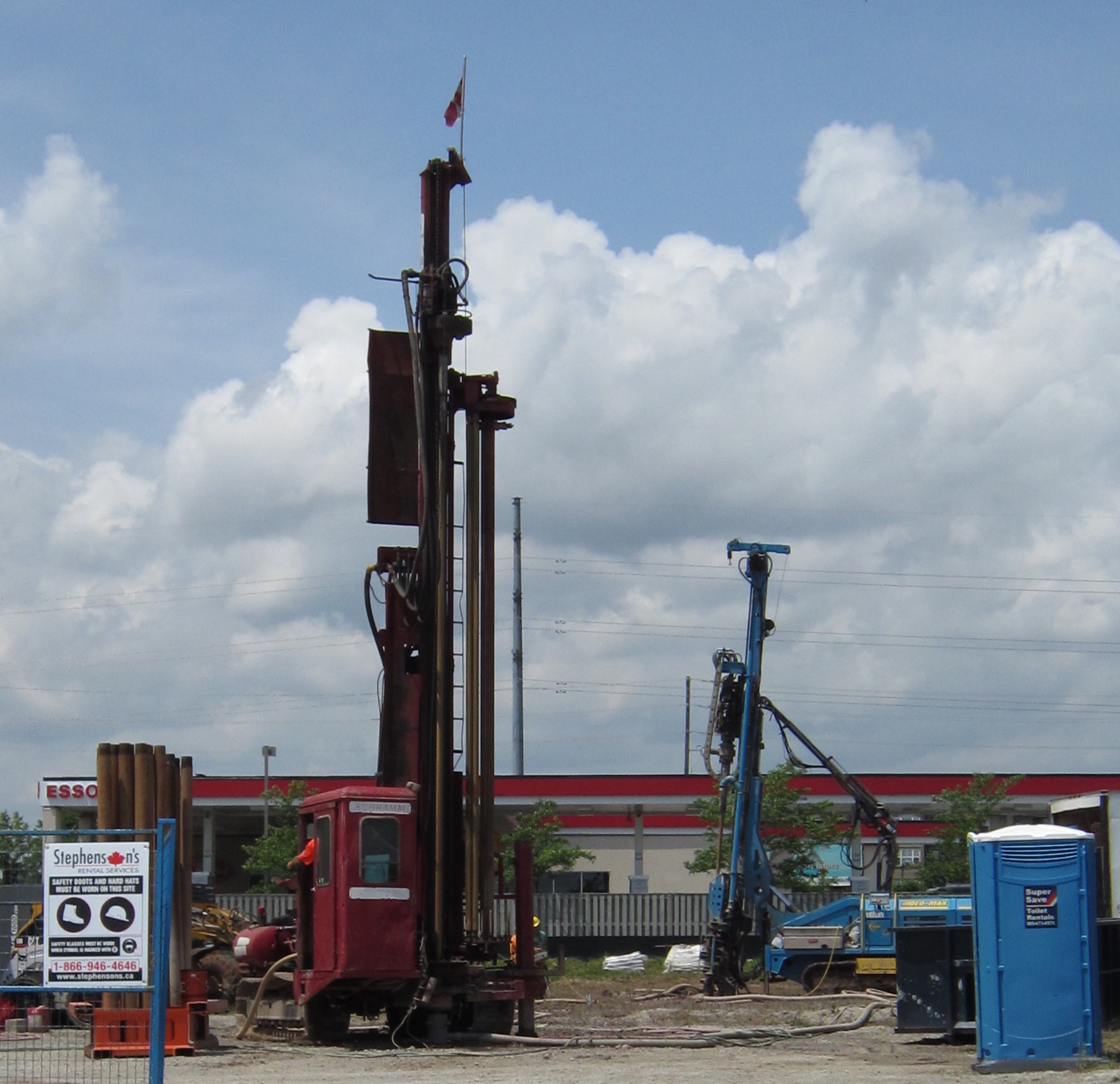 Drilling rig that bores into the ground for the pipes that will be used to carry heat into the building. Heat exchangers convert the heat into cool air during the summer months.